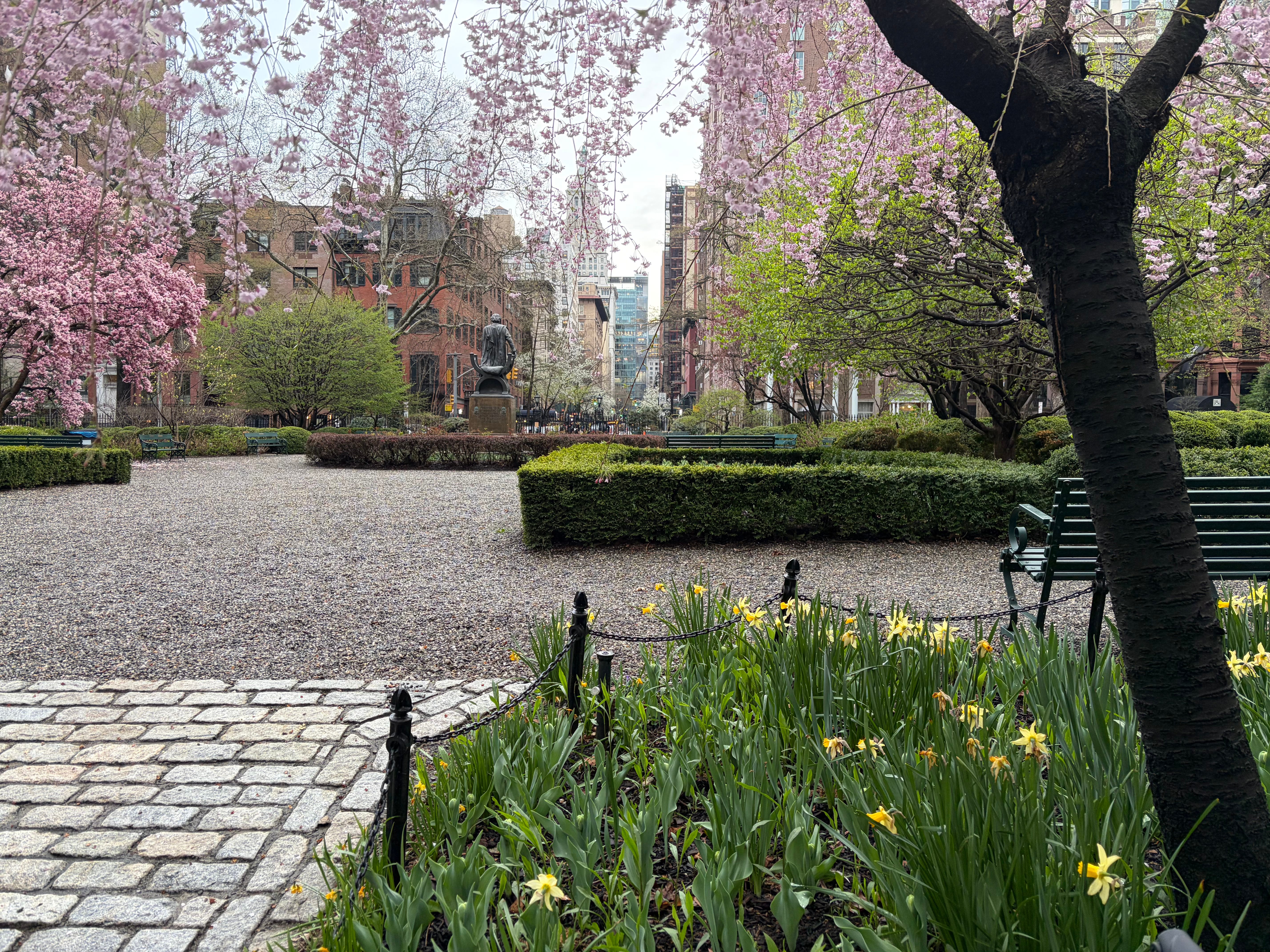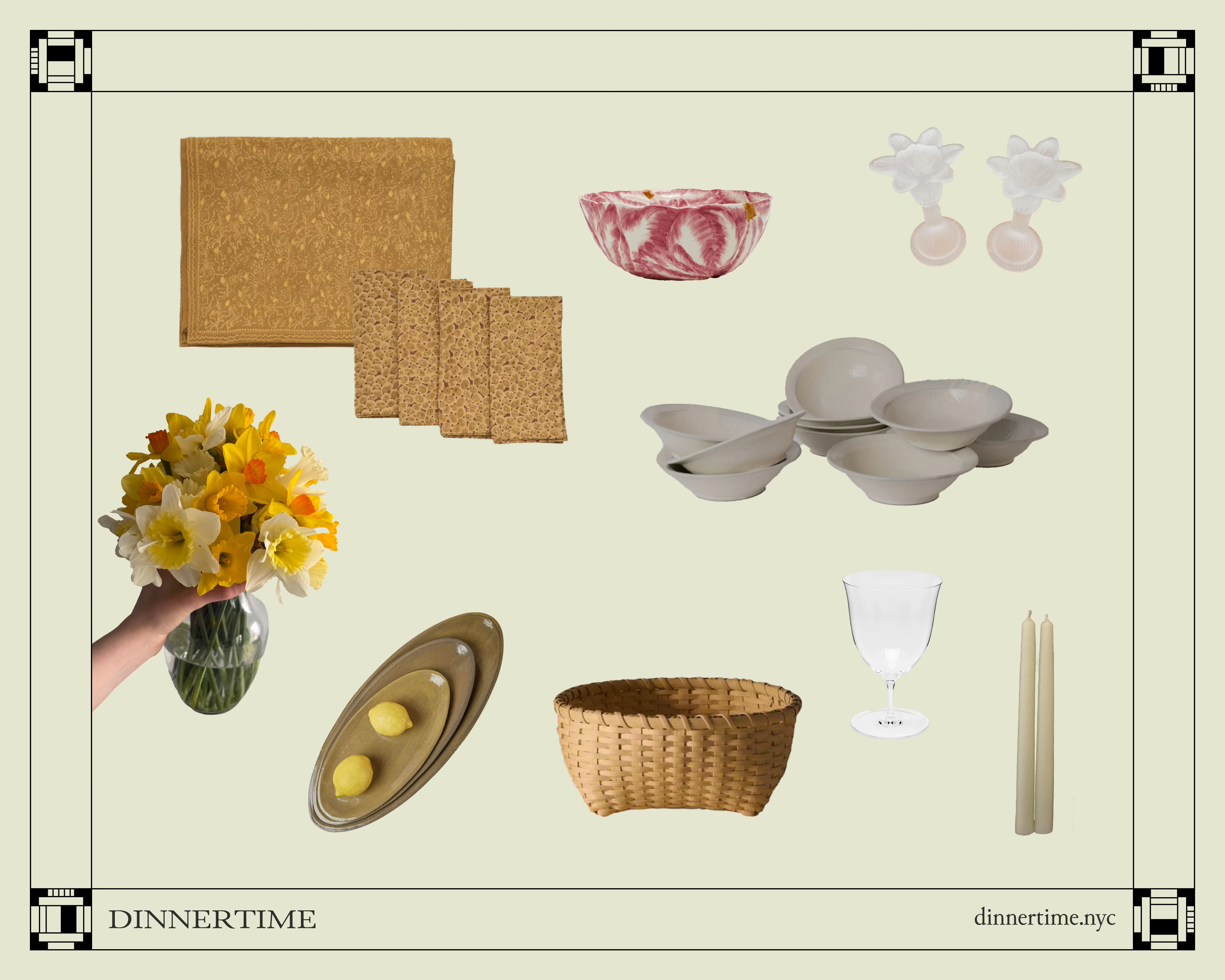 In April, I let florals do most of the heavy lifting in setting the tone for a gathering. This month, I’m leaning into the yellow, white, and orange hues of springtime daffodils. Seeing the yellow flowers popping up in the beds surrounding Gramercy Park is always a first sign of hope for the warm weather to come. The Union Square Farmers Market on Saturdays has the best variety and tends to offer bulk discounts.