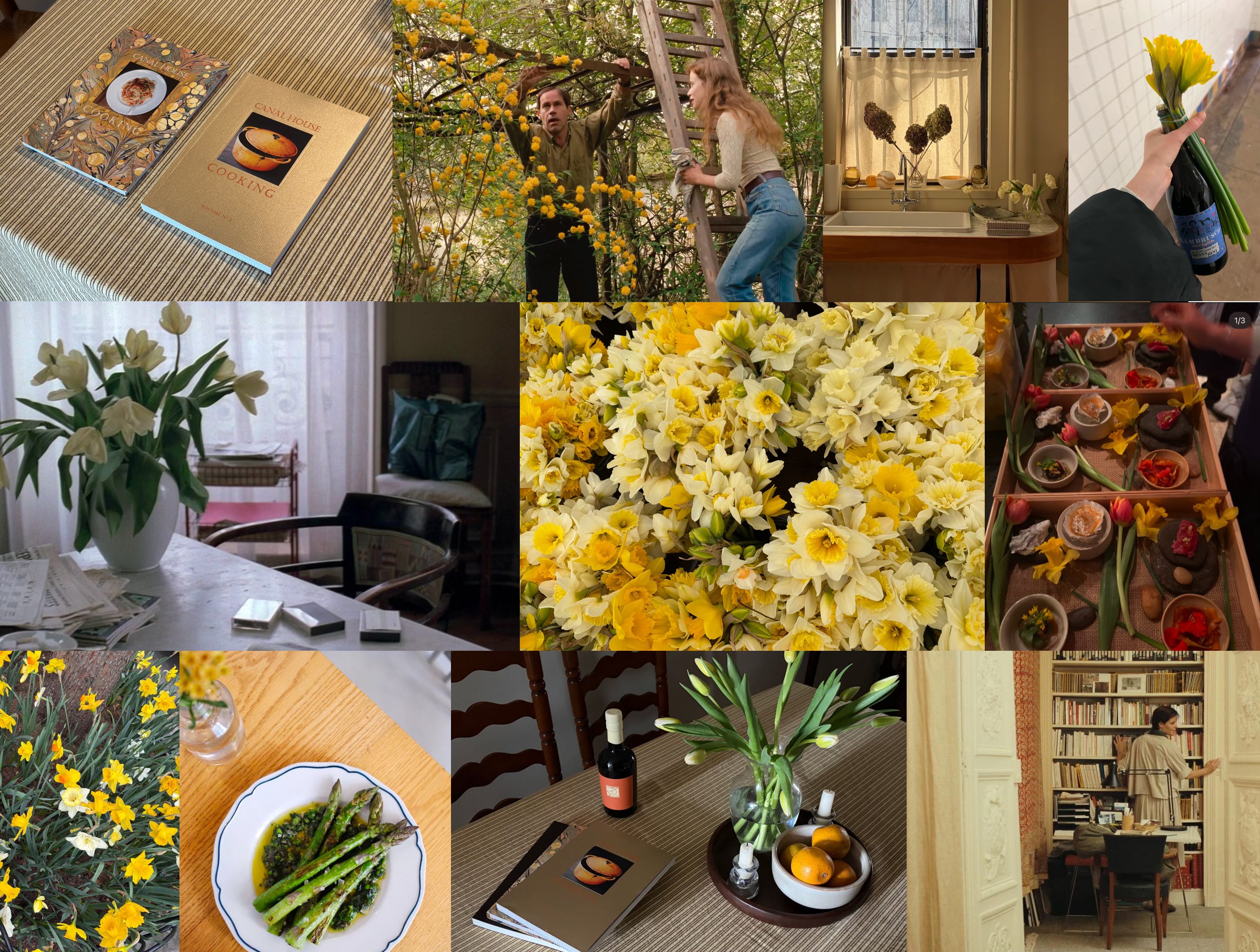 This weekend, I watched Eric Rohmer’s A Tale of Springtime for the first time. The film is a wellspring of seasonal visual inspiration, from the verdant exterior shots to the Vienna Secession-inspired, creamy interiors. Potential romance blossoms alongside the yellow flowers in the garden, with the spaces reflecting the emotions at play. Though several of the most important scenes of the film occur around the dining table, food itself does not play a central role. Still, the mise en scene left me dreaming up table settings.