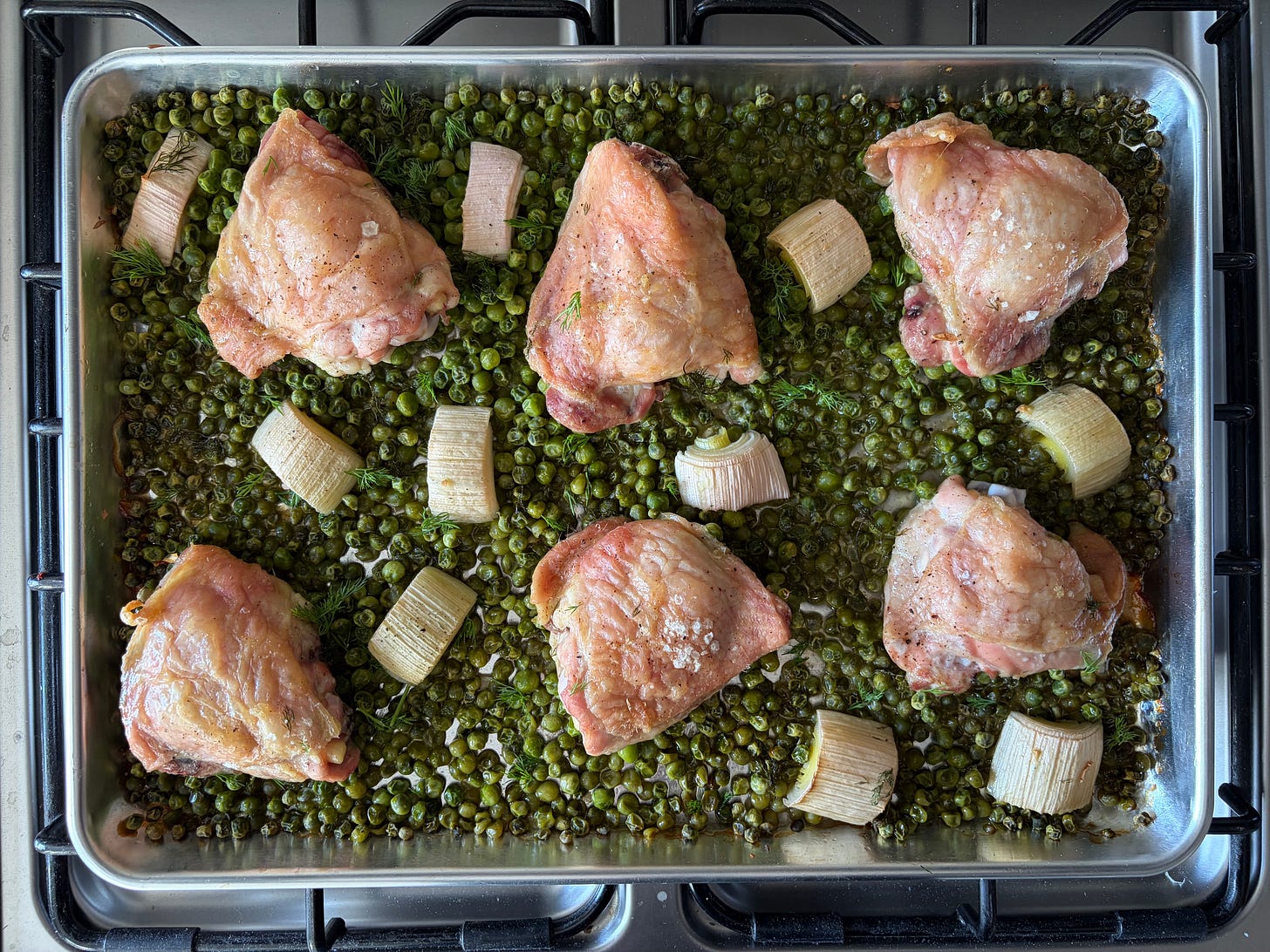 Nigella’s Chicken and Pea Traybake - a delicious and easy meal (with minimal prep) for when people are coming over from the queen of non-fussy hosting. Serve with potatoes or a salad with shaved asparagus and a zesty dressing.