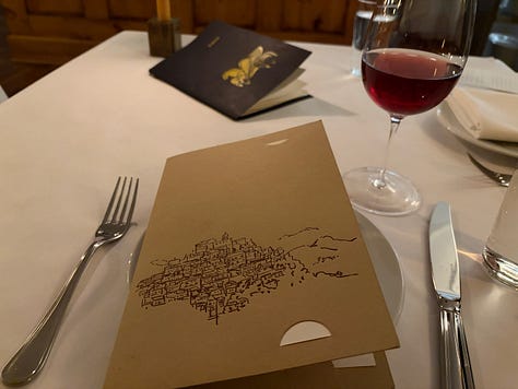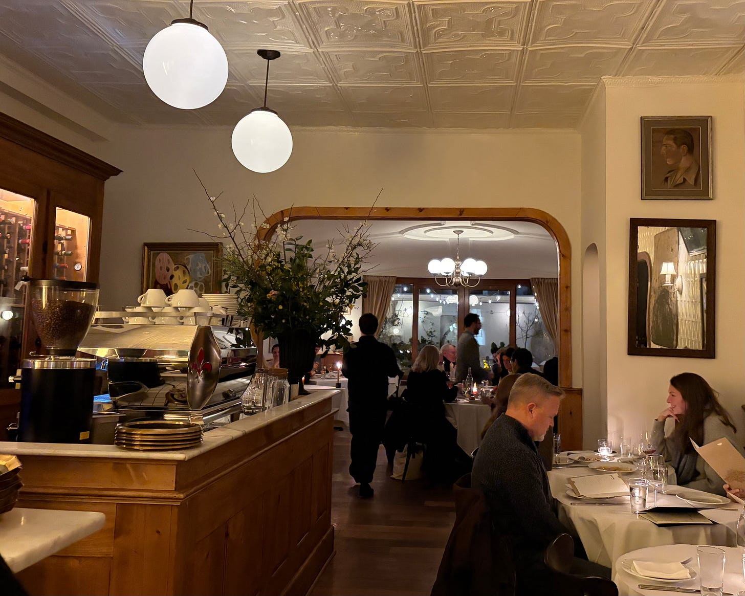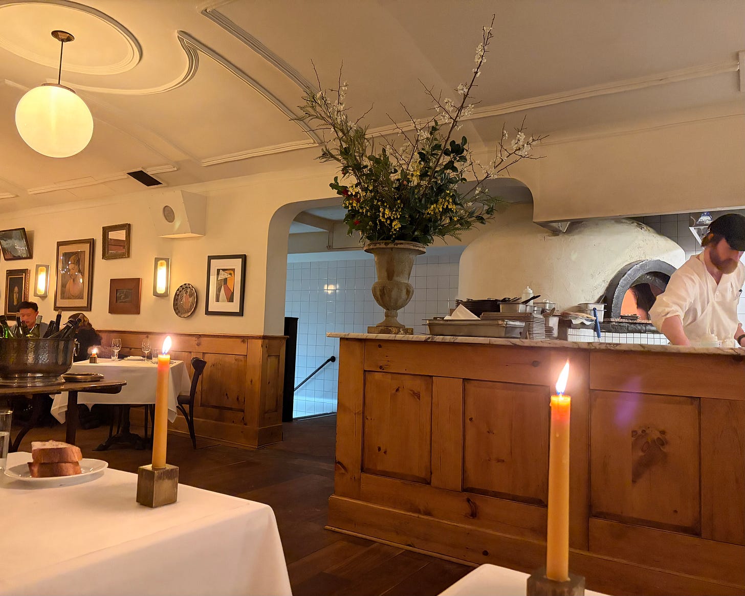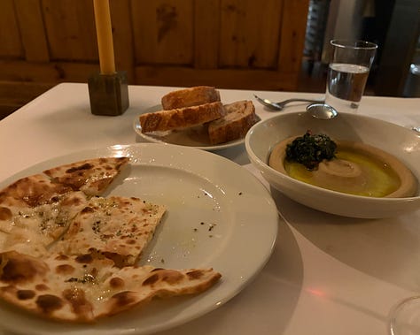 When we arrived, precariously stepping over the snow bank and heading inside, I was reluctant to give up my coat. When we were led into the dining room, I immediately knew I had made the wrong decision in keeping it. We were seated opposite a large wood burning oven and not far from a lit fireplace. All weekend, I had said that the only thing that could have made our apartment more cozy was a fireplace, and suddenly I had two.