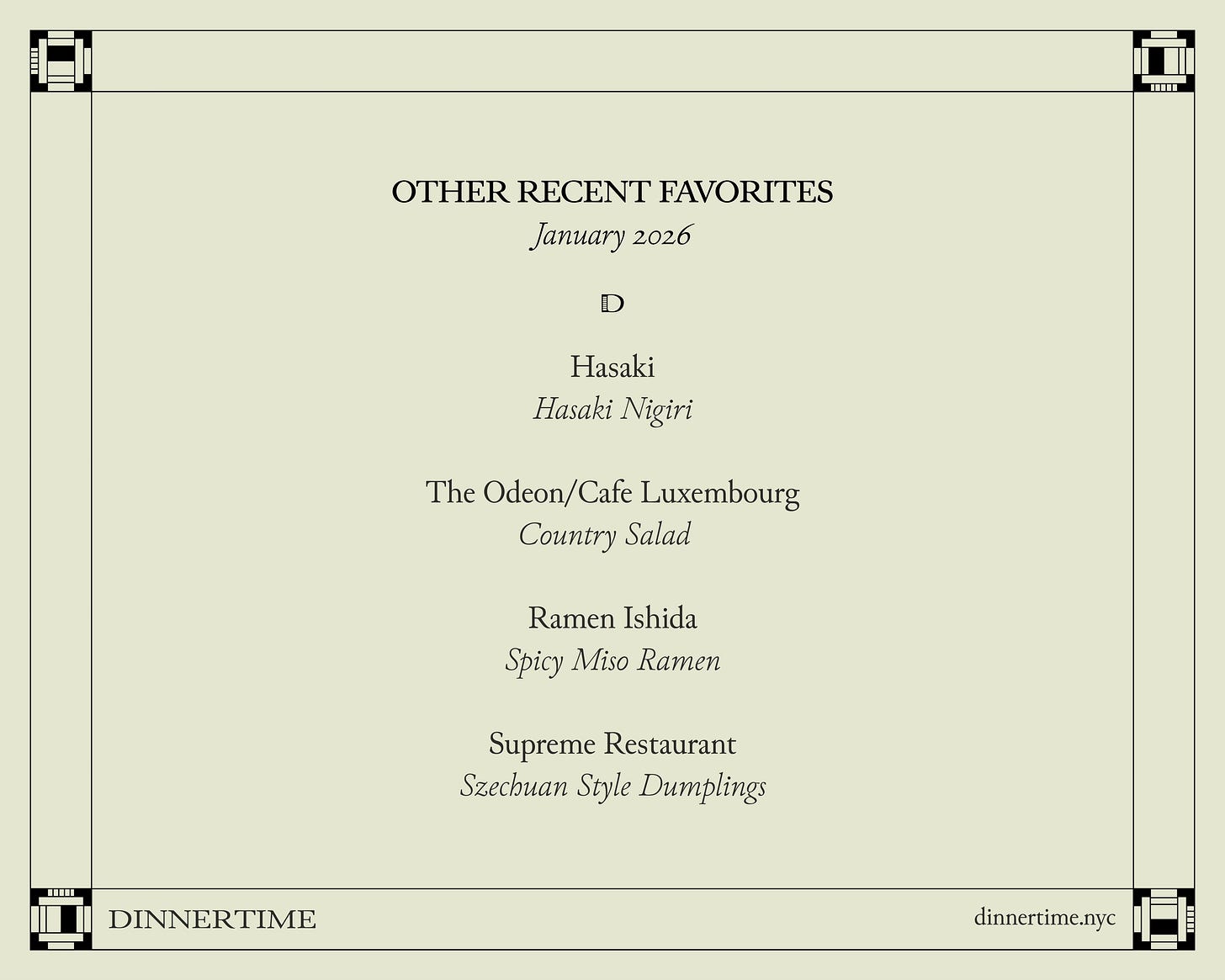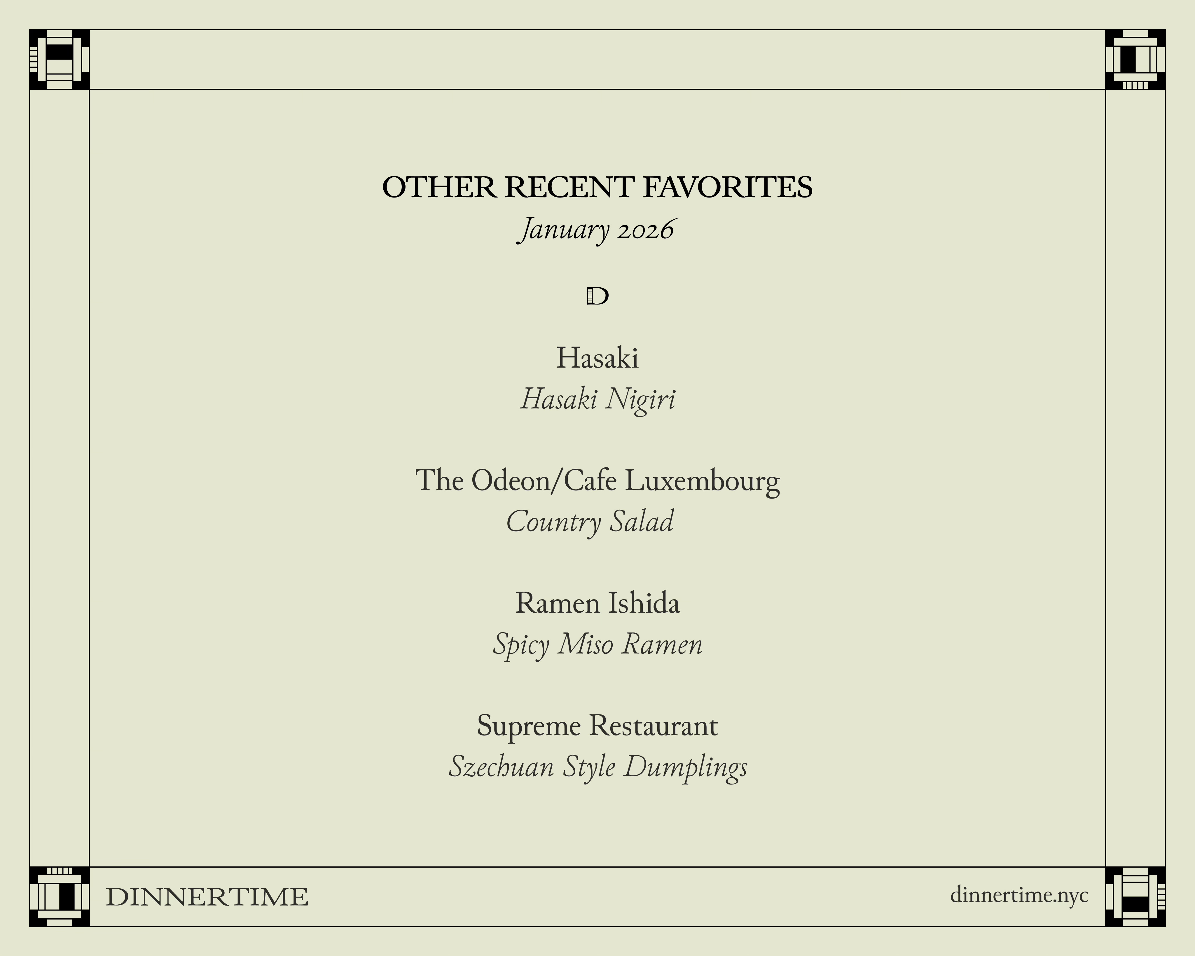 Sushi that transported me back to a ryokan in Japan. A perfect frisée salad with bacon lardons, poached egg, and blue cheese. Our go-to ramen the moment we start feeling sick. New Year’s Day dumplings in a spicy peanut sauce. These are other meals I’ve enjoyed this month.