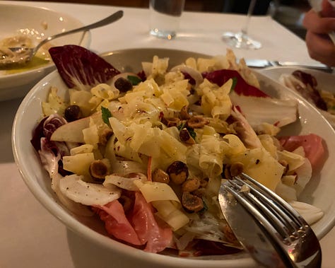 Menu highlights included the chicory salad, the ravioli di zucca, and the fettuccine with Guinea hen ragu. The bitter chicory paired with sweet apple, rich hazelnuts, and creamy gouda was for me a perfect pairing, expertly executed. The Borgo focaccia was good, but Spencer and I agreed we preferred the sourdough served alongside the excellent fava bean puree.