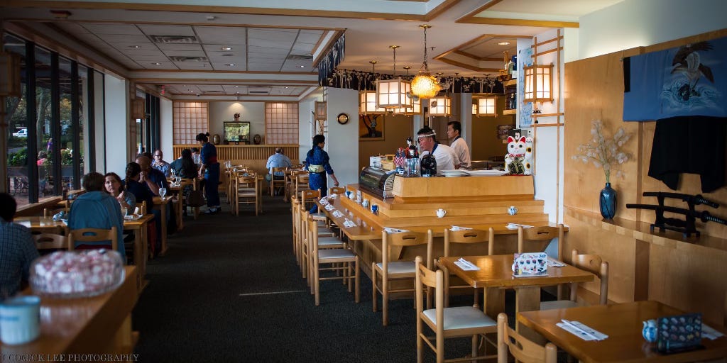My sister was in town for the weekend to attend the aforementioned wedding. Over lunch, we were recalling the sushi restaurant we frequented growing up in Maryland. As a family of five, we would typically sit at a larger table in the front or back. Only on rare occasions when we visited alone with our mom or dad did we sit at the counter. We would watch closely as the sushi chef (who aptly went by the name King) prepared our rolls with a pufferfish lamp hanging above him.