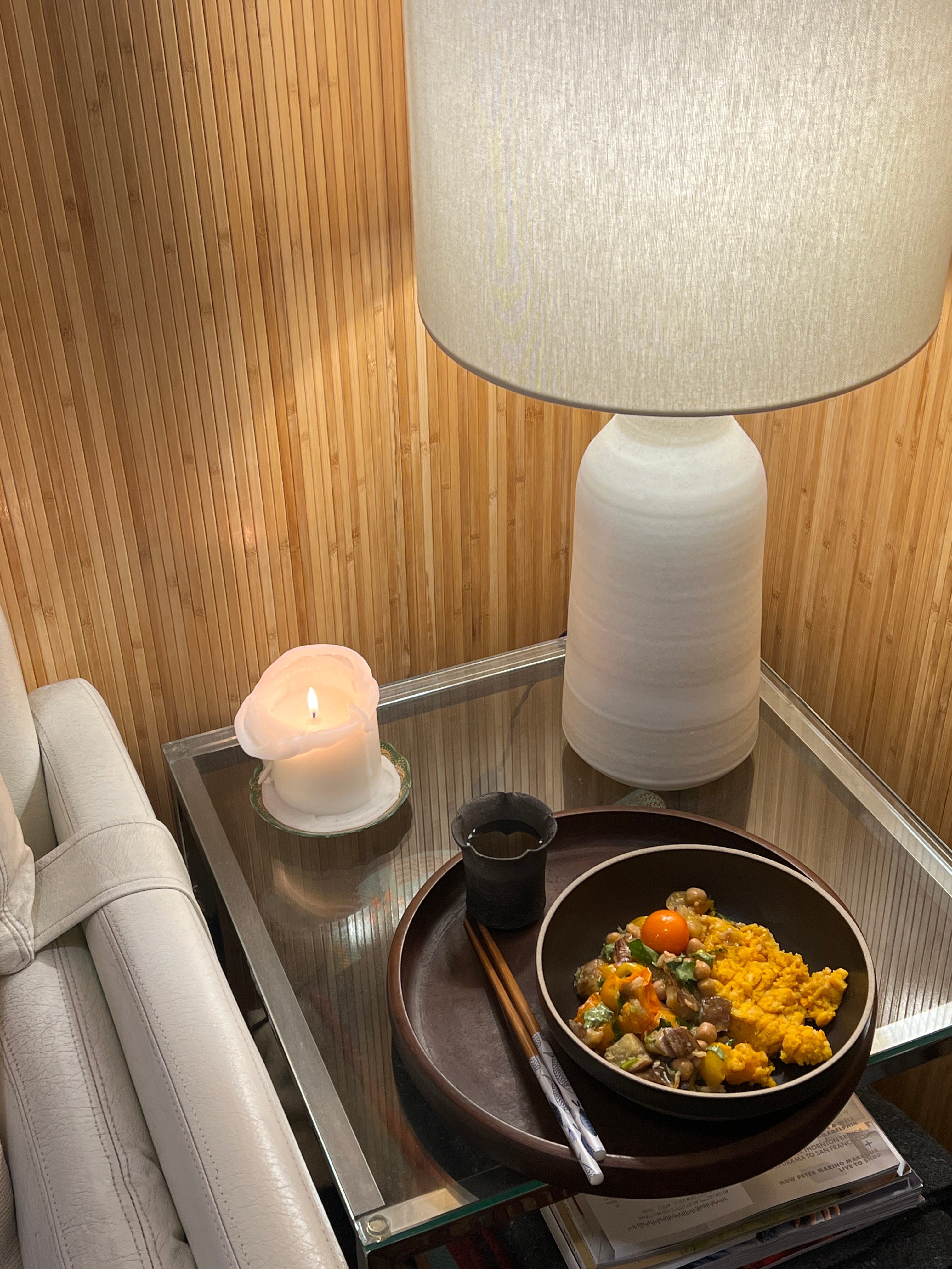 Meal In: Stewed Eggplant, Tomato, and Chickpeas with Kabocha Rice and Cold Brewed Sencha