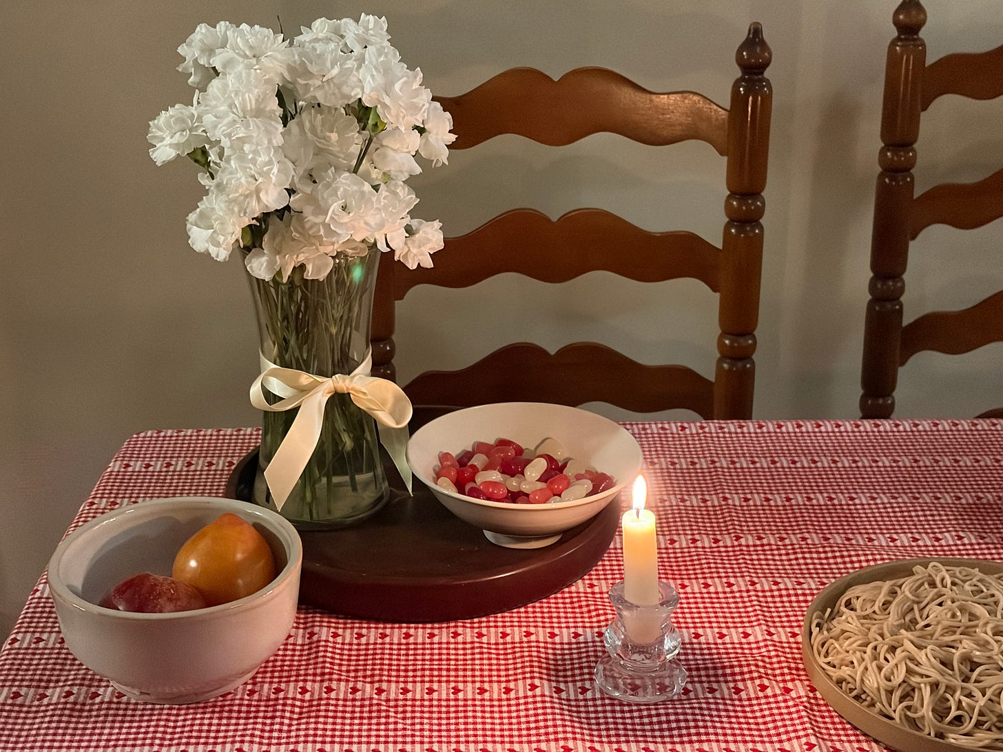 Beyond that, I kept it simple with ivory candles in glass candlesticks, and white carnations Spencer brought home earlier in the week.