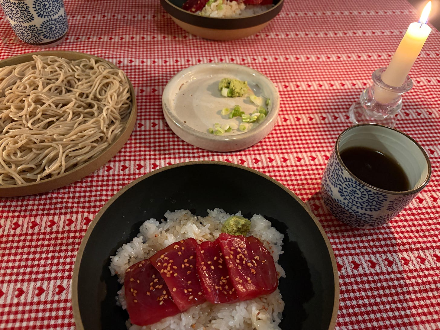 Alongside the tuna, I decided to make miso soup and cold soba. On Sunday around noon (right as the snow started), I ventured out to Ni Japanese Deli in Essex Market nearby, and purchased soba, a bag of rice from The Rice Factory (cannot recommend enough), and some dried seaweed for the miso soup. If I had better foresight, I would have picked up a bottle of sake.